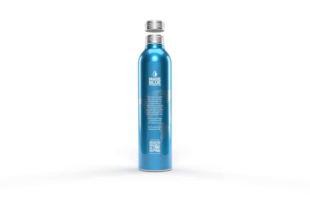 De Aluminium Bottle Blue is uit voorraad beschikbaar per doos van 72 stuks met een sprekende Made Blue opdruk.