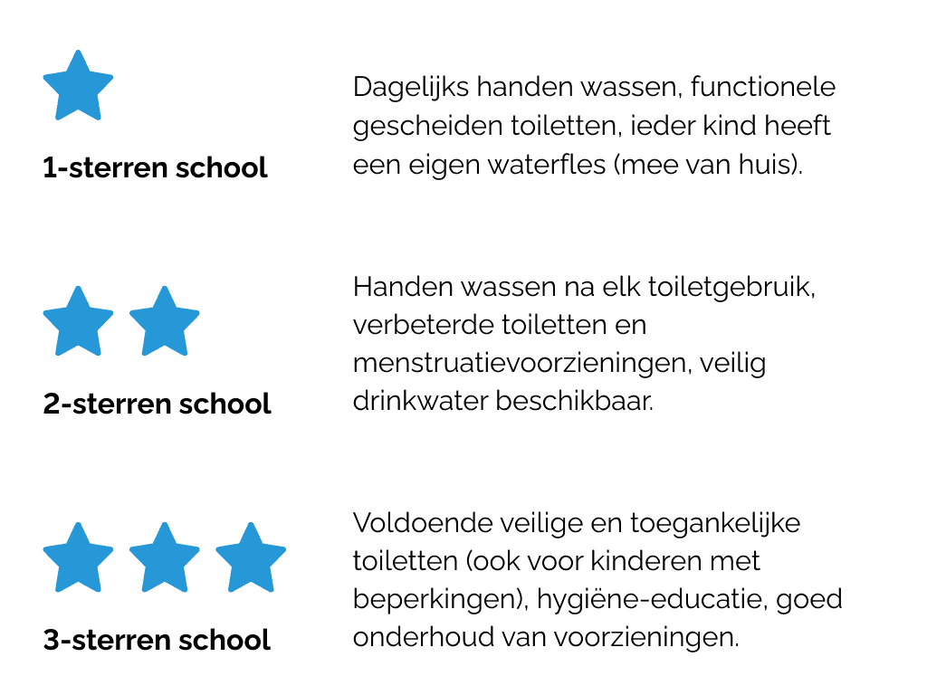 Hiervoor werd gebruikgemaakt van de JMP-ladder en de 3-sterrenaanpak, die laten zien welk niveau van water, sanitatie en hygiëne een school biedt.