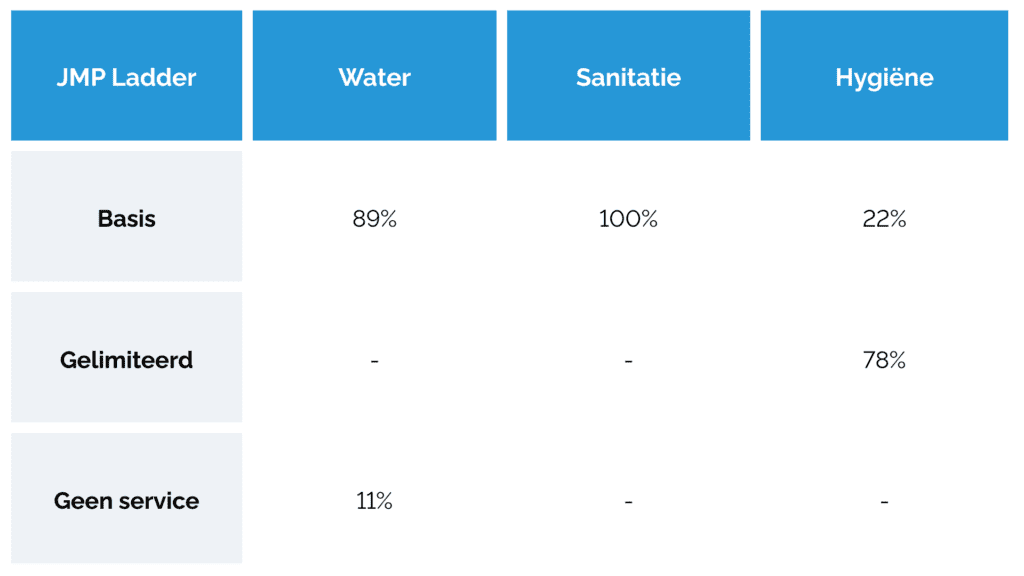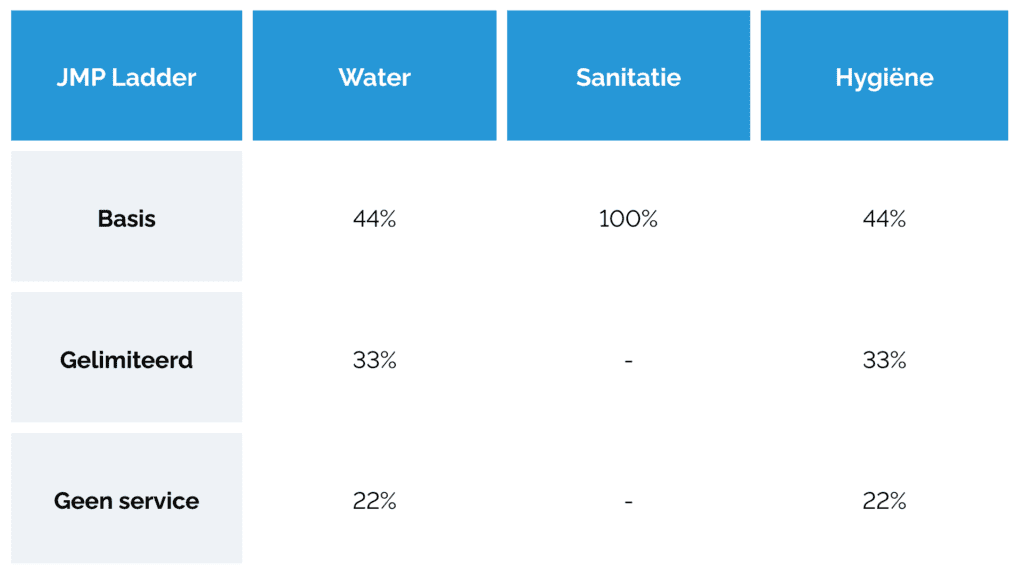 Uit de JMP-resultaten blijkt dat 89% van de scholen basiswatervoorziening heeft: drinkwater uit een verbeterde bron dat tijdens het onderzoek beschikbaar was. 11% is afhankelijk van een onverbeterde bron of heeft geen drinkwatervoorziening.